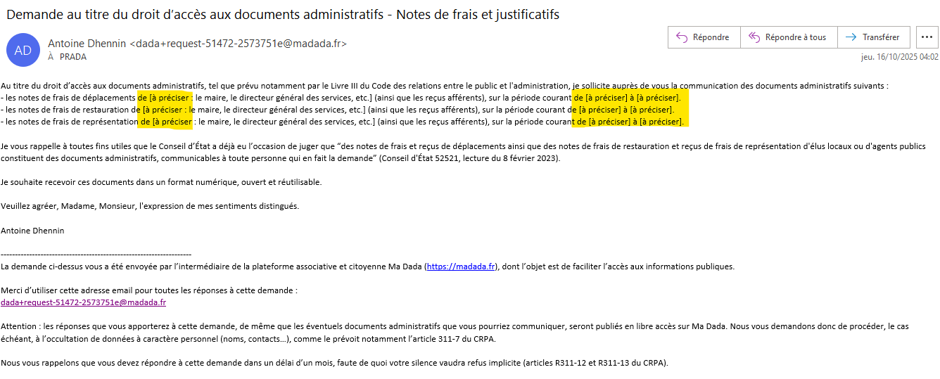 Je vous rappelle à toutes fins utiles que le Conseil d’État a déjà eu l’occasion de juger que “des notes de frais et reçus de déplacements ainsi que des notes de frais de restauration et reçus de frais de représentation d'élus locaux ou d'agents publics constituent des documents administratifs, communicables à toute personne qui en fait la demande” (Conseil d'État 52521, lecture du 8 février 2023).